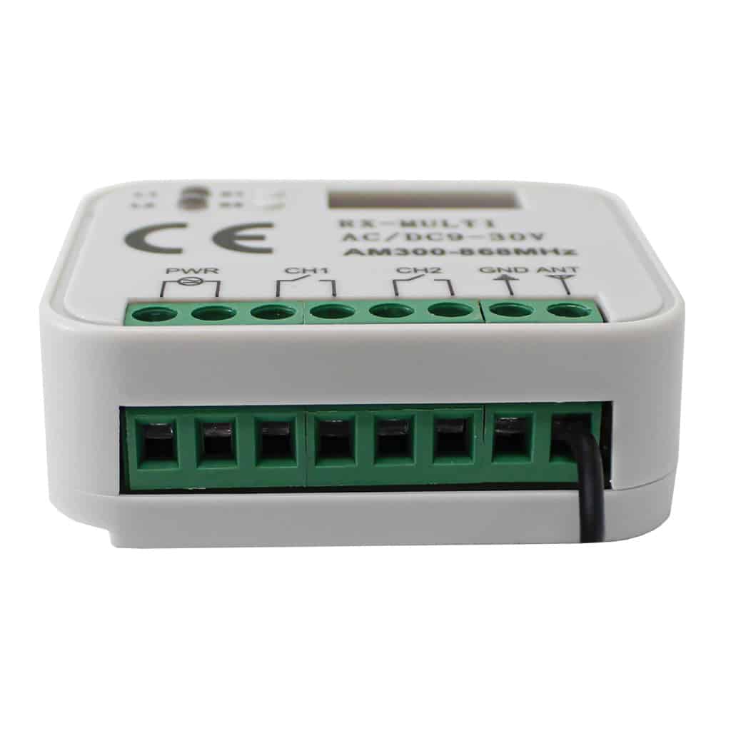 The ADS RX-Multi frequency receiver 300-868MHz AM, for controlling electrical applications such as garage doors, electric windows, and automated gates. The RX-Multi works with remote control units with fixed, learning, rolling codes that operate within a frequency range of 300MHz to 868MHz in AM format. This means it’s compatible with various remote codes – making it a reliable choice for remote control applications..