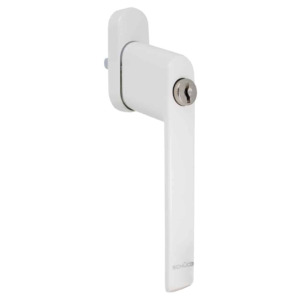 Schuco multi-point tilt & window handle in various finishes with a 17mm length spindle. Key locking with push button to operate. Includes a genuine Schuco 932 key and fixings. Works with Schuco tilt & turn windows.