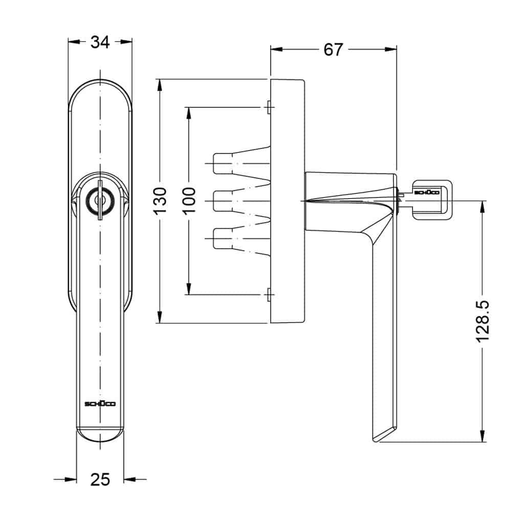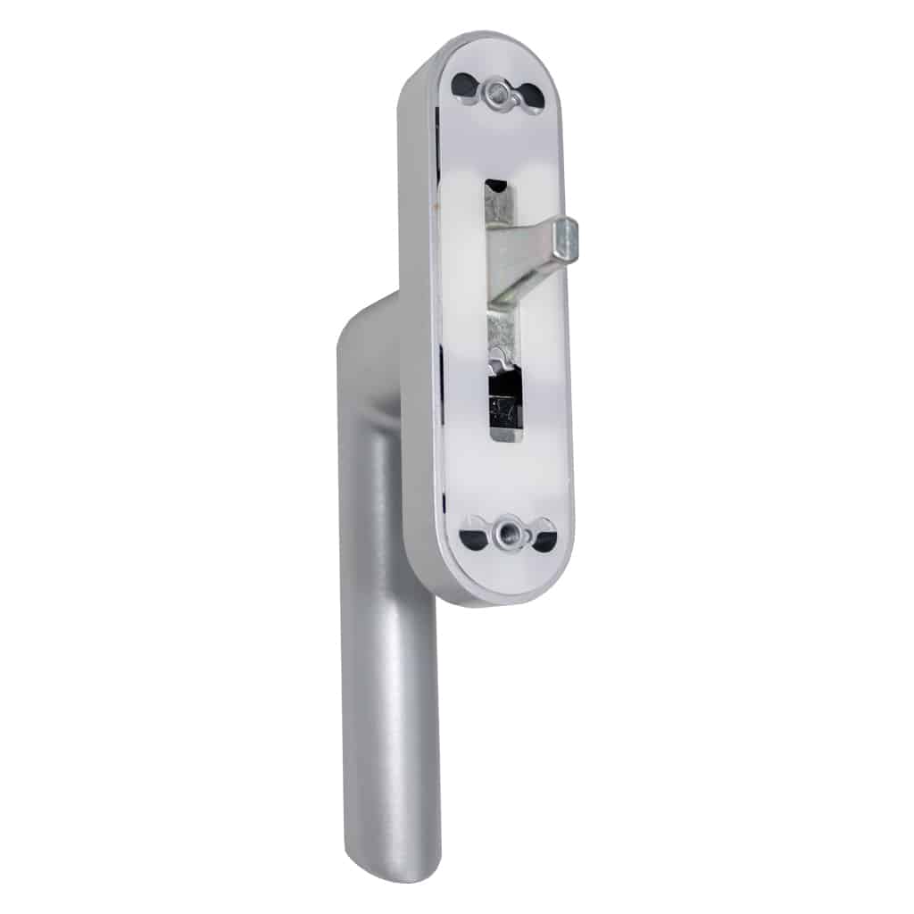Schuco tilt and turn handle with blade. This bladed handle is key locking and non-handed, making it a versatile choice when choosing a replacement tilt and turn handle. It comes in a silver finish.